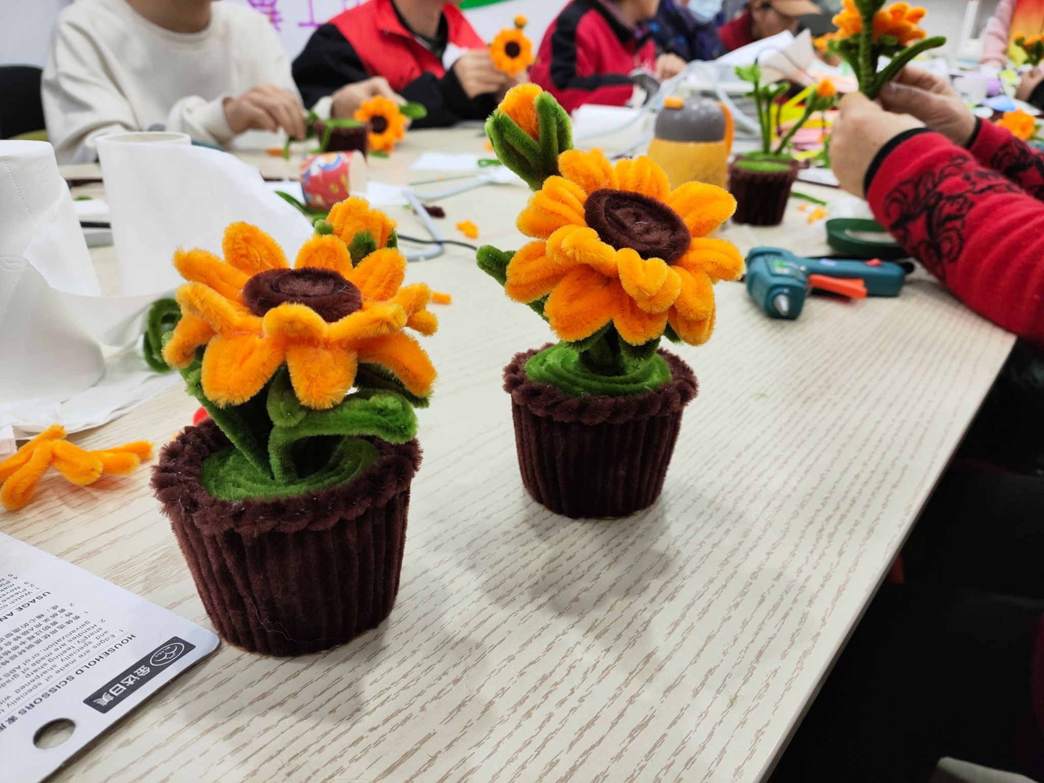在华锦社区吴老师的指导下,志愿者们用简单的材料和工具制作出各种精美的手工花。几根颜色各异的扭扭棒相互交叠缠绕,再用热熔胶将各个部分粘起来,插入纸杯做成的花盆中,一株株玫瑰、郁金香、雏菊、百合等手工花,就在手中诞生了。次日,青凝志愿服务队的志愿者协助华锦社区进行义卖,所得善款均汇入湖北省慈善总会,更好地支持残障人士的权益保护工作。