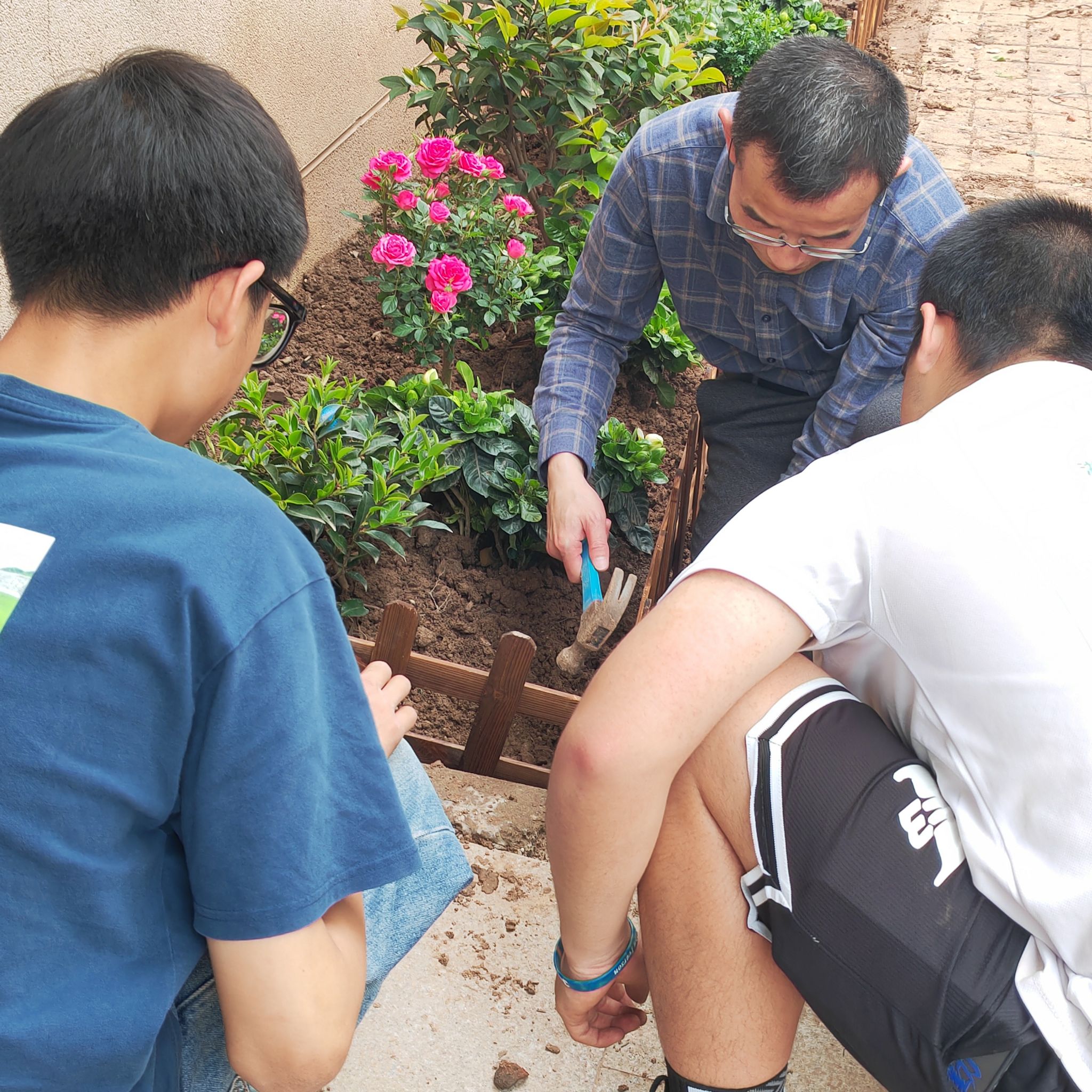 活动过程中,邀请园林专业老师为同学们详细讲解各种花卉的形态特征、生长习性等相关知识,铁锹、锄头等劳动工具的使用方式和注意事项,并示范翻土平地、撒种浇水等操作要点。师生们掌握方法,团结协作,挥锹翻土、移盆栽花、浇水灌溉,各个环节衔接有序,配合默契。在师生的共同努力下,学院“一站式”学生社区门口的劳动实践园地种满了栀子、月季、杜鹃等。